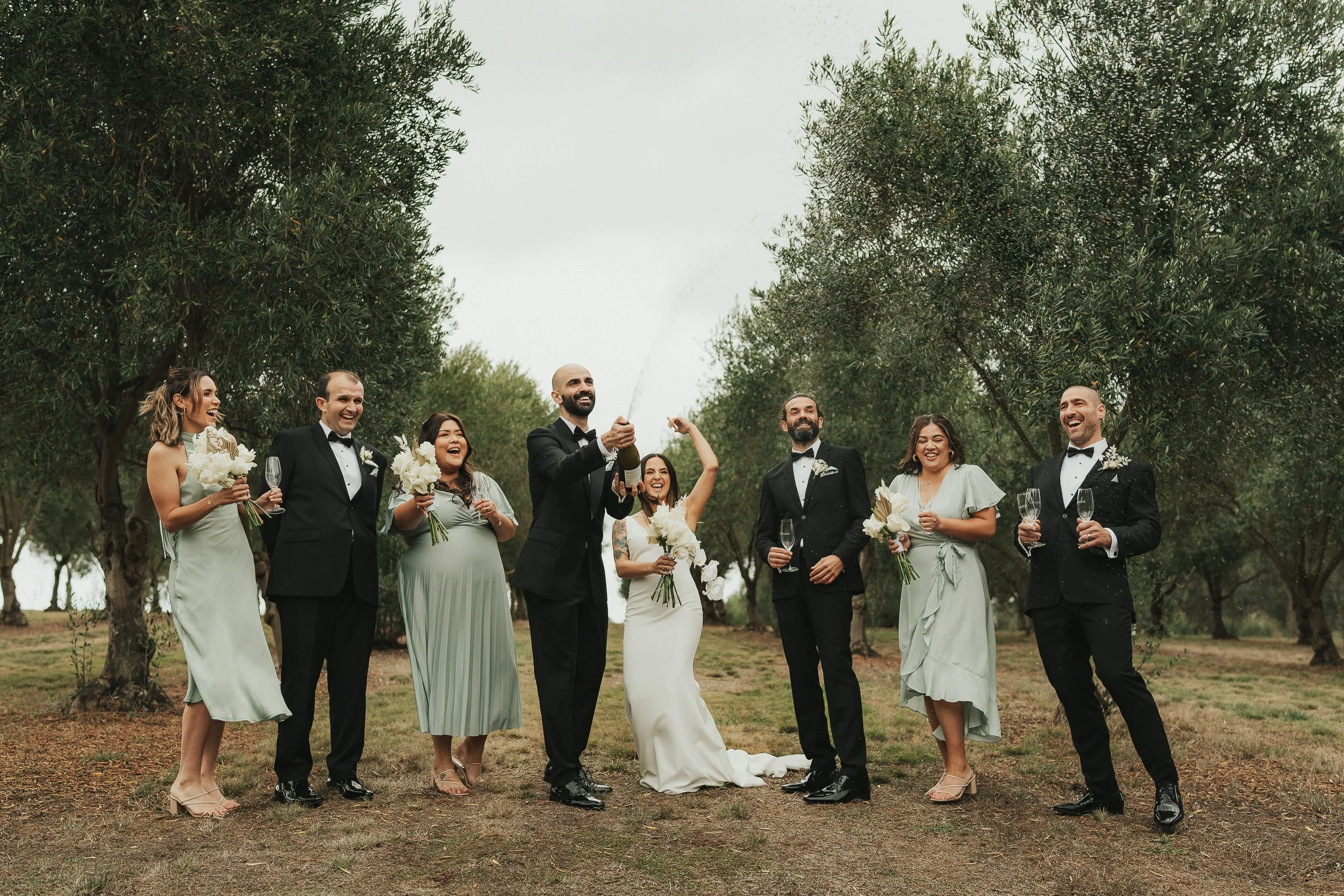 Mt Duneed Estate was a perfect setting situated in the heart of Victoria's picturesque countryside not far from Geelong, Mt Duneed Estate offered a truly enchanting backdrop the outdoor ceremony amongst the olive grove. The sprawling estate spans over 100 acres and is surrounded by rolling hills, lush vineyards, and magnificent gardens. This idyllic setting creates a serene and romantic ambiance, transporting guests to a world of refined luxury in their beautifully decorated reception hall that can seat up to 350 guests with a 10x10m dancefloor for when the tunes kick in. Stevie & Jimmy went as far as having a custom mural chalked onto the blackboard and ran the wedding party table across the front of the barrels stacked sky high. A green neon completed the pizzaz.